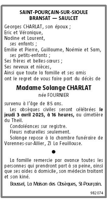 Décédée à Vichy (03200, France) le vendredi 28 mars 2025 à l'âge de 85 ans