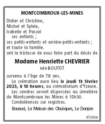 Décédée à Moulins (02160, France) le lundi 10 février 2025 à l'âge de 78 ans