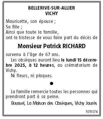Décédé à Vichy (03200, France) le mardi 9 décembre 2025 à l'âge de 67 ans