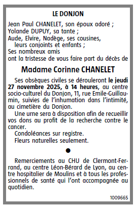 Décédée à Moulins (03000, France) le dimanche 23 novembre 2025 à l'âge de 62 ans