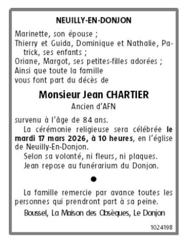 Décédé à Neuilly-en-Donjon (03130, France) le vendredi 13 mars 2026 à l'âge de 84 ans