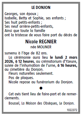 Décédée à Vichy (03200, France) le mercredi 25 février 2026 à l'âge de 82 ans