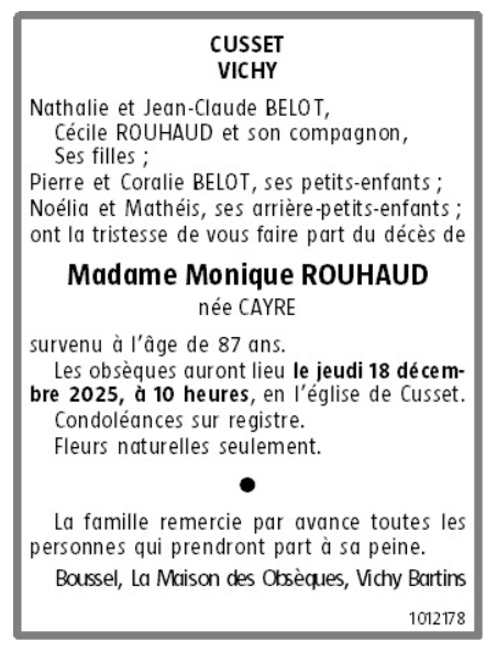 Décédée à Bellerive-sur-Allier (03700, France) le samedi 13 décembre 2025 à l'âge de 87 ans