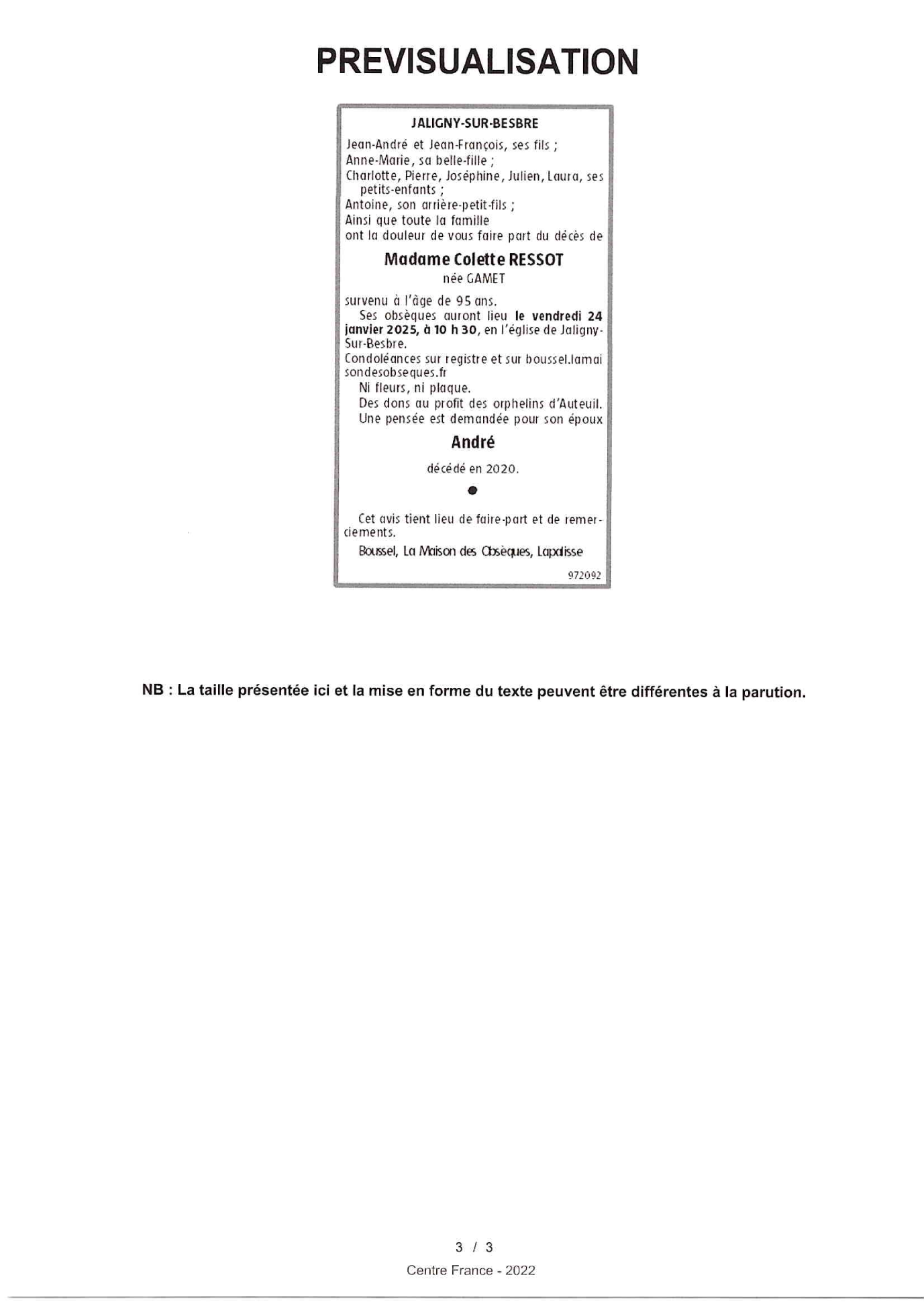 Veuve de Monsieur André RESSOT